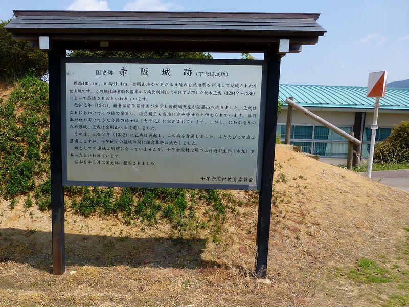 千早赤阪村立中学校の敷地を抜けると、尾根のところが少し平らになっていて、そこにトップの写真の石碑やこの案内看板、そしてトイレなんかがあります。ちなみに、背後に写っているのが千早赤阪村立中学校の校舎。それにしても、学校敷地近くでカメラなんか出していると、不審者扱いされないかなんて思ってしまいますね。(まぁ、私自身不審者というか、変なオジサンなのは間違いないが。)