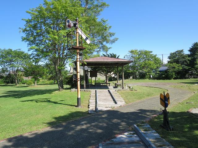 それと構内の一部は鉄道記念公園として整備され、C11形蒸気機関車の動輪や、腕木式信号機、転轍器標識なんかが置いてありました。
