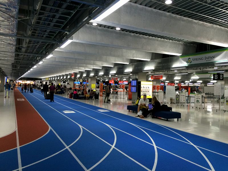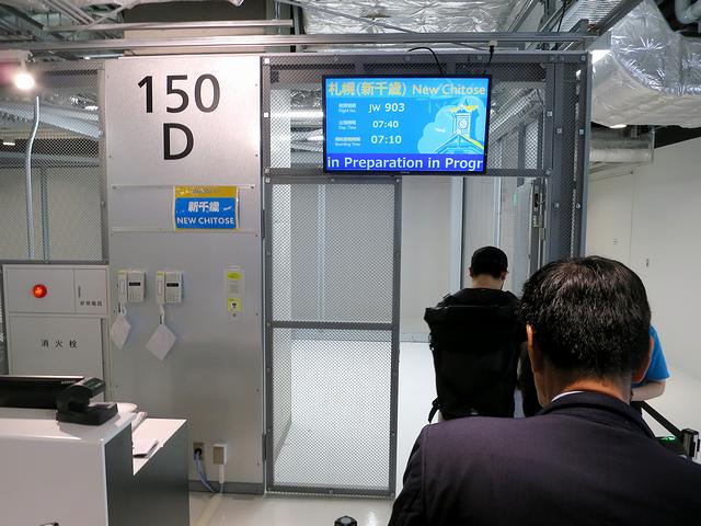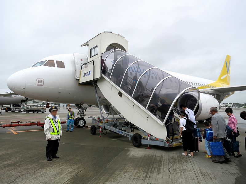 成田空港の第3ターミナルは、LCC専用ターミナルとして、今年の4月にオープンしました。なので当然、お伺いするのは初めて。事前にWeb媒体で見た、陸上のトラックのように線が引かれ、動線ごとに色分けされた通路など、実際に見ると面白く、かつ分かり易いのに感心しました。あと、昔で言う「ロフト風」の建物は、チープさをうまいことデザインに生かしてるよなぁ、とこちらも感心。で、搭乗手続きを済ませて荷物を預け、出発まで少々時間があったので、空港内のフードコートで朝食を。そして保安検査所を通過して、出発ロビーで東アジア系の方々に囲まれながらテレビを何となしに見ていたのですが、その時やっていた天気予報によると、丁度帰る日あたりに台風が北海道に接近する見込みで、帰りの飛行機が飛ぶか心配に。もっとも、今はそれを外れることを祈るしかないんですが。やがて搭乗開始時刻となり、搭乗するバニラエアJW903便は、なんとバス連絡。(第3ターミナルはターミナルから直接登場できると聞いていたので…。)なので雨の中、連絡バスで駐機場まで行きタラップから搭乗しました。