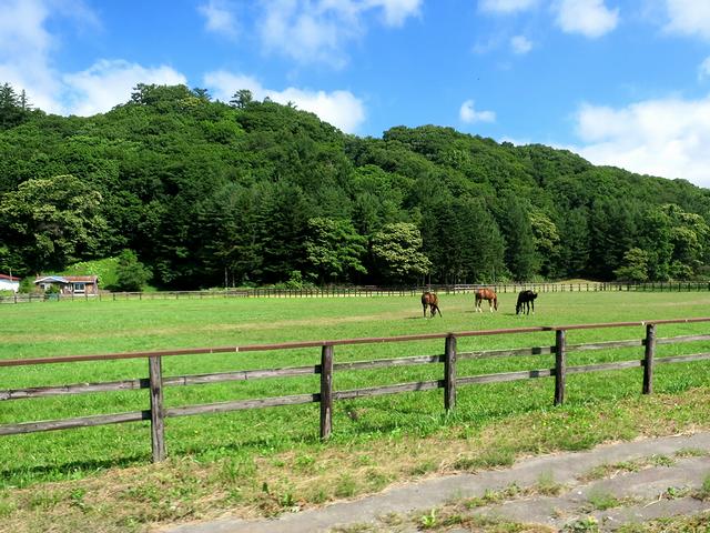 実は昨日、門別競馬場に居る時、本日最初の目的地である牧場に電話をして、訪問のお願いと、その時間を決めてありました。なので、それに余裕を持って間に合うよう逆算した結果、午前7時半に宿を出発。途中でセイコーマートに寄って朝食を仕入れつつ、まずは国道235号で旧静内町を目指しますが、右手にはずっと太平洋があり、海霧の影響か、フロントグラス越しの景色がもやっとして見えます。そして旧静内町からは、北海道道71号平取静内線に入り、更に道なりに進むと途中から北海道道111号静内中札内線に入るというルートで、牧場を目指したのですが、さすがは馬産の本場。(昨日の門別競馬場の周りもそうだったのですが、)今朝、宿を出発して以来、沿線にはサラブレッドの牧場が多数点在し、それを見るたびにテンションが上がってしまします。
