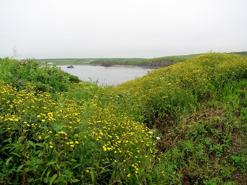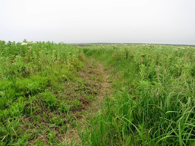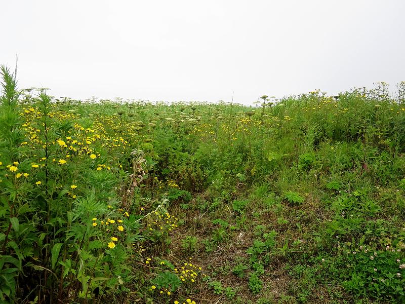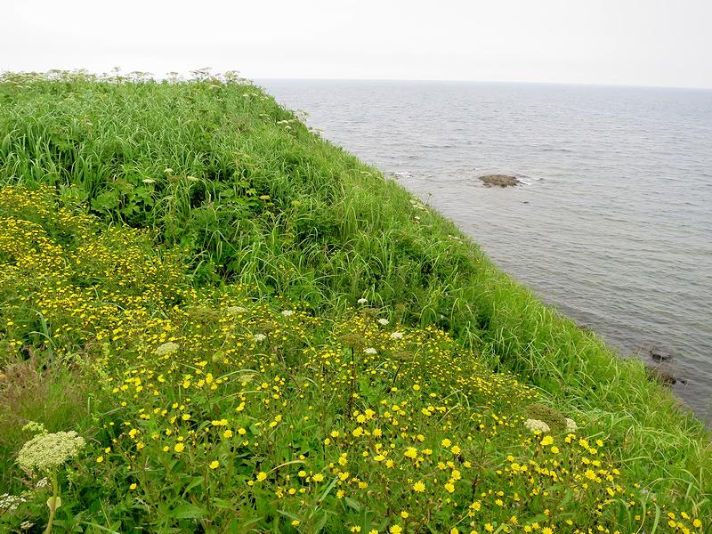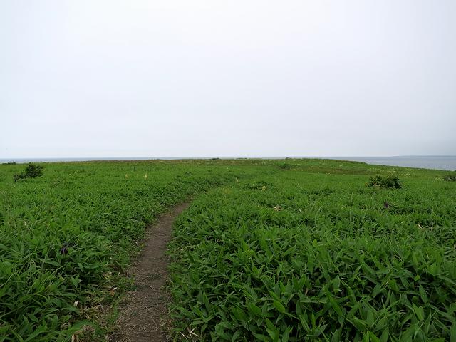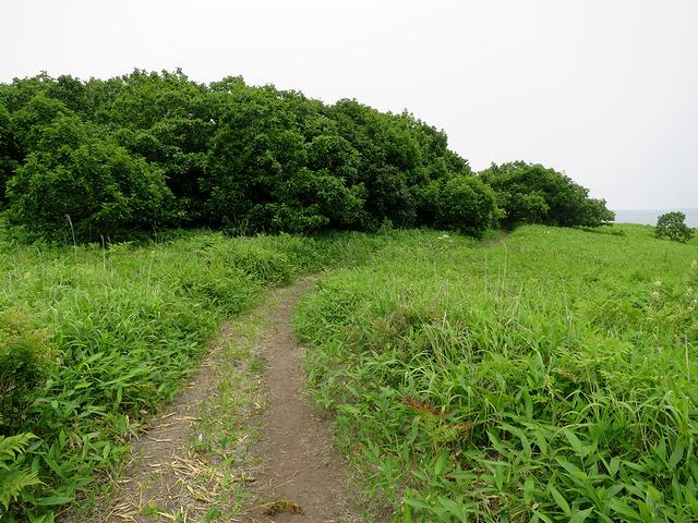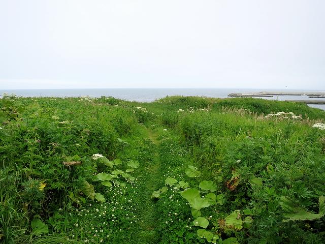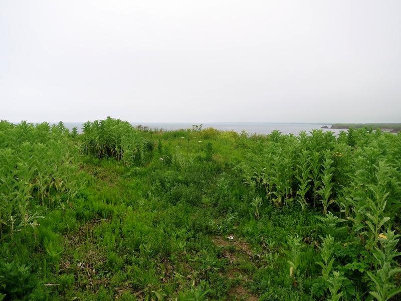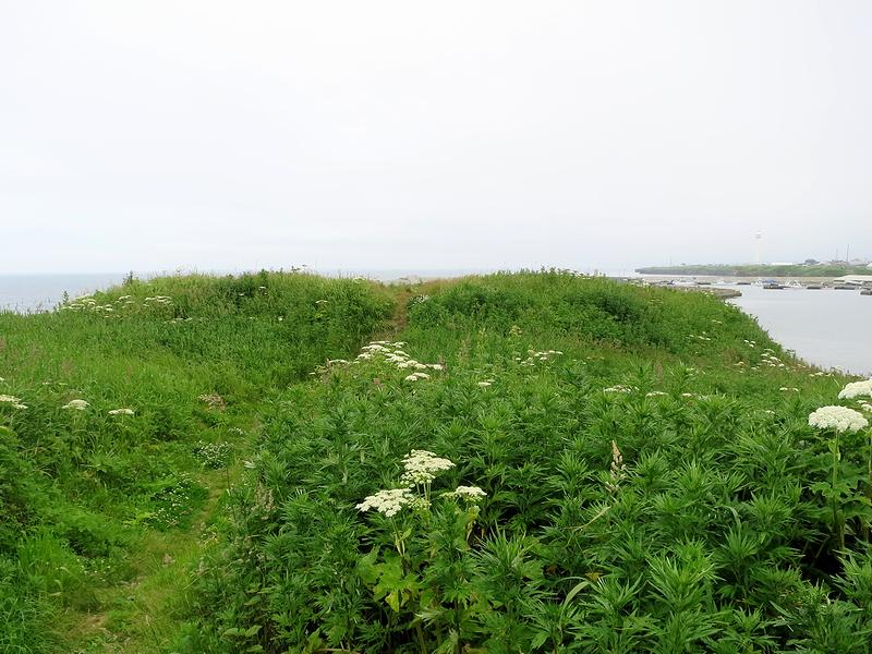 階段を上ったあたりから、チャシのある岬の先端方向を。それにしても、草が生い茂って地形がよくわからなかったりします。
