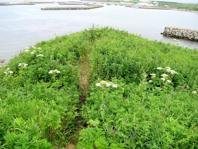 で、先に訪れたのがノツカマフ2号チャシ。こちらは、崖の上部の海に面したところに、半円形の堀に囲まれた平坦面が1つ有ります。また、堀の幅が2~3m、深さは50cm程度と結構狭くて浅いのが特徴でしょうか。