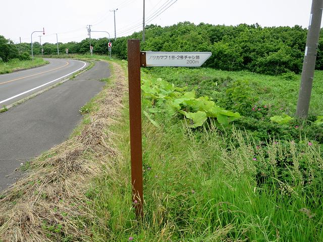 その通路をズンズン進むこと暫し。先程のヲンネモトチャシよりはチャシへと続く通路が長くてクネクネしています。で、若干不安になってきた頃に丁字路にぶつかり、そこには左に行くとノツカマフ1号チャシ、右に行くと左に行くとノツカマフ2号チャシという案内看板がありました。