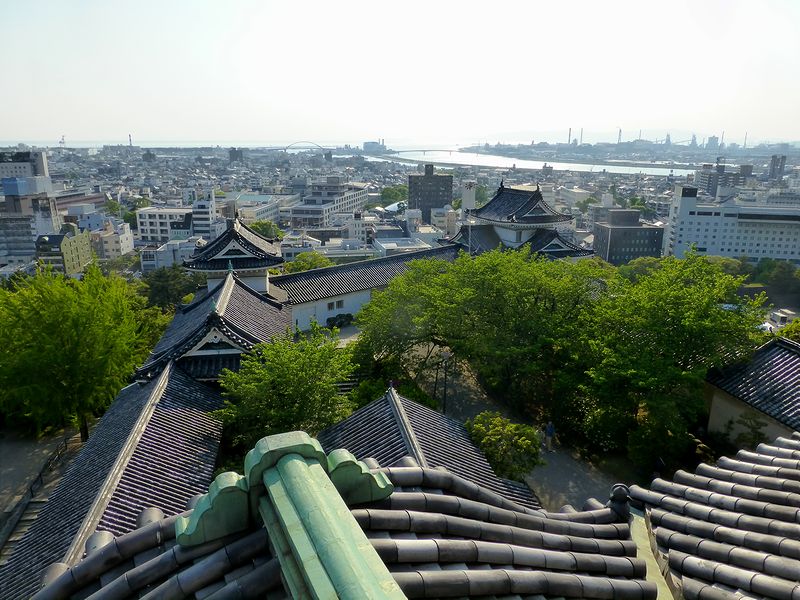 天守の復元に携わったのは、前述のとおり東京工業大学名誉教授の藤岡通夫氏なのですが、氏が関わった復元天守にはかの中津城といった結構な物件もある中、この和歌山城はかなり以前の物に忠実に作られたそうで、復元の際に窓を増やしたりすることが多い中それをやらず、大きさにもこだわって復元されたそう。で、天守の中はお約束の資料館。そこに展示されている資料も興味深かったのですが、個人的には、昔の鉄筋コンクリート建物ということで、その造作とかに興味を惹かれたりして。また、天守最上階に登れば、こちらもお約束の絶景。あと、珍しい連立式天守の二の門櫓から楠門(二の門)、そして乾櫓といった建物群の繋がり方もよくわかります。