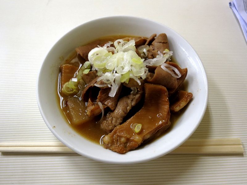 お品書きに赤字「味自慢」と書かれていたがこちらの品。テイクアウトも出来るようですね。また650円でこれの定食もあるのですが、そちらには「国産高級牛もつ」と書かれていていました。(ちなみにそんなアピールするような文句が添えられていたのはこの2品だけでした。)で、そのお味ですが、味付けは甘味がなく、味噌っぽい感じもがするもさらっとしていて、かなりあっさり目。これは、モツが良くなきゃ出来ない味付けですね。またその牛モツは大ぶりに切られて、プリサクっとした食感が、また。