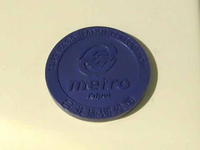 それで入口から駅に入って、路線図兼運賃表で運賃(票價・ピャオジャー)を確認した後、自動券売機(自動售票機・ジードンショウピャオジー)で乗車券(車票・ツァーピャオ)を購入して改札口(剪票口・ジァンピャオコウ)へという流れは日本と共通で安心なのですが、ひとつ驚いたのが、乗車券。紙の切符ではなく、コインを模したIC式乗車券になっているんですね。