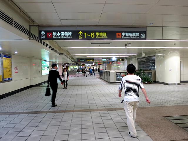 民權西路站は淡水信義線と中和新蘆線の乗換駅にもなっているのですが、淡水信義線の乗り場に向かう場合、先程の路線図で路線番号がラインカラー(ちなみに、淡水信義線は路線番号が2、ラインカラーが赤)を覚えていればオッケー。案内板は中国語と英語表記ですが、中国語は繁字体の漢字なのでわりと読めますし、そうでなくても色と番号を頼りに案内に従って進めば、ちゃんとプラットホーム(月台・ユエタイ)に到着します。下手げに表示言語を増やして案内表示がごちゃごちゃするというか、それでパッと見戸惑うよりも、路線番号とラインカラーで案内する、乗る意思があれば目に飛び込んでくるこっちのほうが、個人的には良いと思いますがね。