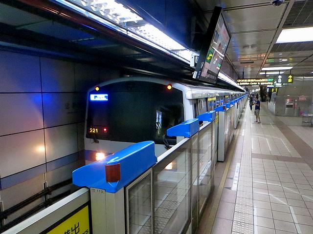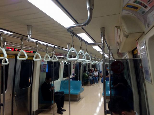 大安站では、新交通システムを使用する文湖線に乗り換え。ちなみに、台北捷運では新交通システムの列車を中運量列車と称するそうで。で、やって来たのは4両編成のCITYFLO650型中運量電聯車。龐巴迪(ボンバルディア)製の車両で、現在走っている2種類の中運量用車両のうち新しい方。その車内は樹脂製のロングシートが並ぶのですが、車幅が狭いので、シートに座っている人達は強制的にお見合いをさせられてるようですね。もっとも、こちらは一駅で降りてしまうので、何となく立っていただけで次の忠孝復興站に着いてしまったのですが。