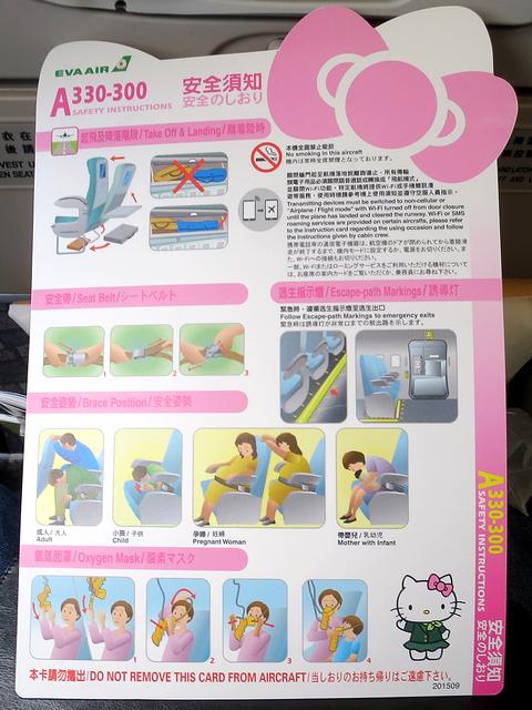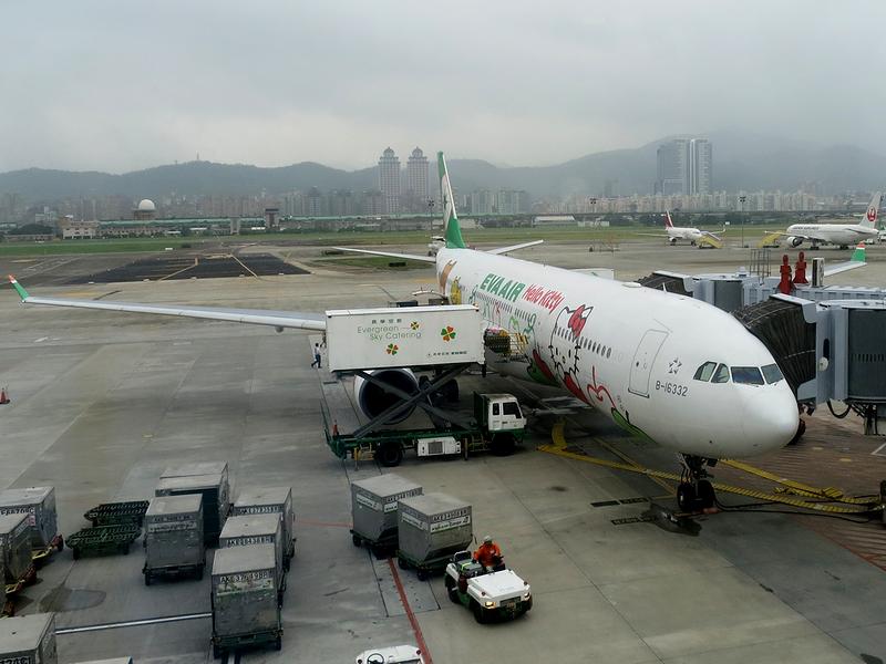 羽田空港から搭乗するのは、エバー航空(長榮航空)BR189便、午前10時50分発台北松山空港(臺北松山機場)行きで、使用機材は個人的に初めてとなるエアバスA330-300なのですが、なんと、ハローキティジェットと呼ばれる特別塗装機です。ちなみに、台北には松山の他、国際線ではメインの台湾桃園国際空港(臺灣桃園國際機場)もあるのですが、ここが今回、幹事さんのこだわったところ。台北市内から遠い桃園空港だと、今回のメンバーが旅慣れた人ばかりなら各自バスなど使って移動できるのですが、私を含めほとんどが台湾は初めてで、更にはクルマばっかり使う栃木の人なので公共交通機関に慣れてない(鉄道の乗り換えに苦労するレベル)人も多くいるということで、台北市内にある松山空港着のこの便を使うことにしたらしいです。(ちなみに、桃園空港利用の場合、旅行会社で用意した団体送迎バスがあるのですが、途中で土産屋に拉致られるとのこと。)と、話が逸れましたが、午前10時半前に搭乗開始となり早速機内へ。機内もハローキティ推しで、安全のしおり(安全須知)や機内エンターテイメントシステムのデモ画面にいたるまで、もう、全てがハローキティ。同行者でそれを理由に「(安全かどうか)おっかない」と言っていた人も居ましたが、日本に乗り入れている他の台湾の航空会社と較べると、確か、安全度ランキングでエバー航空の方がぜんぜん高いんですよね。で、また話が逸れましたが、BR189便は、ほぼ定刻に搭乗口を離れ、D滑走路からテイクオフ。エコノミークラスなのでもの凄くとは言いませんが、椅子は快適。CAさんは日本人も居て日本語も通じるようです。やがて水平飛行に移るとチキンorポークの機内食が出たのですが、ポークを選択。軽いと聞いていたのに結構ボリューミーというか、チキンはトマトソースにパスタと軽めに見えたのですが、ポークは豚の角煮的なモノにご飯、そこに更にパンが付くという。もっとも、味的には悪くないというか、変に尖ったところがない味付けで、結局完食。またその際、台湾ビール(臺灣啤酒)をお願いしたら、持ってきたのが食べ始めてから暫く経った頃だったのですが、このへんは食習慣の違いも影響しているんですかね?こちらも味的には悪くないというか、とても軽い口当たりが飲みやすく感じました。