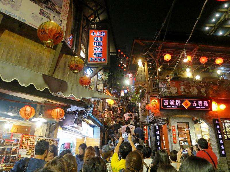 夕食後、いよいよ九份観光へと出発。そこで私たちも幾組かに別れたのですが、私たちの組はとりあえず豎崎路を一番上まで登ってみようということになり、観光客でごった返す階段をえっちらおっちら。階段の両脇には、飲食店や茶藝館と呼ばれるお茶を楽しめるお店、民芸品っぽいものを扱うお店や土産物店などが立ち並んでいました。それにしても、ここの観光客って、台湾の方や私たち日本人はもちろん、大陸から来た方々もいるんですかね?で、一番上まで登った後は、三横のうち一版高いところにある基山街(ここも結構な混雑でした)を歩いたのですが、ここは飲食店が多いようでしたね。ただこの時、時折鋭い臭気に見舞われたのですが、ツアーのガイドさん曰く「よくわからないうちに増えた」という臭豆腐を扱うお店のようです。その臭気攻撃を耐えつつ基山街の終わりまで歩き、今度は軽便路で夕食を取ったお店のあった広場まで。ここは先程までとうって変わって静かな小径というか、沿道のお店も夜は営業しているところが少ないようで。ただ油断して道の真ん中付近を歩いていると、前方からバイクが突っ込んで来たりしましたが。