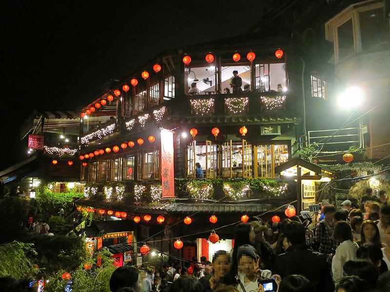 ホテルに戻って小憩し、午後4時40分、ツアーバスに乗り込んで、オプショナルツアーに出発。映画「千と千尋の神隠し」の場所的モデルとなったという(ただし、ジブリ的には否定しているようですが。)九份(ジォウフェン)というところへ向かいます。それで台北市内を抜け高速道路へ乗り、約1時間の道程なのですが、このバスの運転手さん、隙あらばアクセル全開ですっ飛ばします。そういや、空港から乗ったタクシーもかなり飛ばしていた印象があるのですが、そんなところからも台湾を感じますね。で、その道中、市街地から郊外にかけて共通して目に付くのが、マンションになっていると思われる新旧の高層ビル。でも台湾って、地震も起きるし台風も通り道だし、そういう過酷な中で高層建築が発達するって、人口密度というか、住みやすい平地の少なさから来ているんですかね?そしてすっかり日が暮れ、高速を降りると、日本の昔の温泉場というか観光地の雰囲気がちょっとだけしてきて、九份の手前の駐車場に到着。ここから送迎バスに乗り換えていよいよ九份へと向かうのですが、週末で人手が多いためか、私を含め立っている人も多数出るほどの混雑でした。