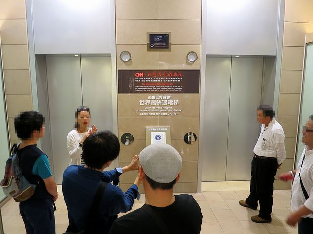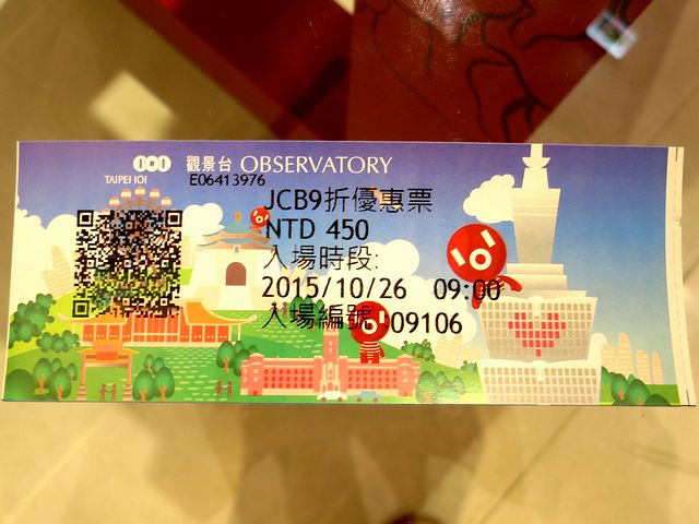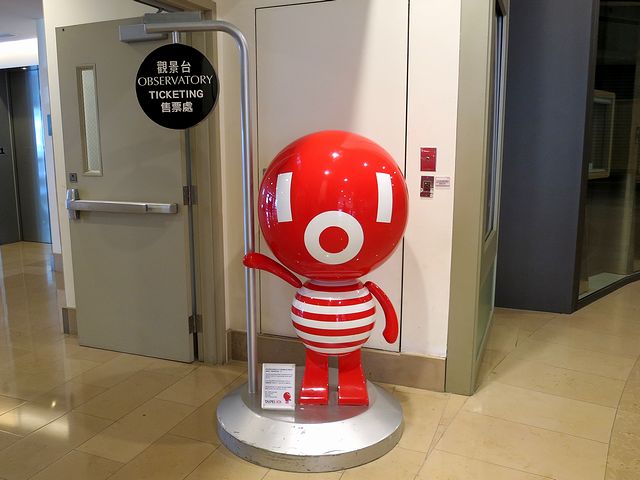 最寄り駅である台北101/世貿駅で下車し、案内に沿って地上に出ると、いきなり目の前に、台北101がそびえ立っていました。ちなみに台北101とは、2004年12月31日のオープン当時には、高さ509.2mが世界で最も高かったという高層ビル。オフィスの他ショッピングモールや展望台(觀景台)も入っている商業複合施設になっており、地上101階だから台北101というネーミングになったということで。それにしても、今回の旅行中その姿を遠目で何度か目にする機会があったのですが、目の前で見るとひときわ高いですね。で、オープン時刻である午前9時には少々早かったのですが、ビルの中へ。で、オープンまではビルの中の照明が暗かったということもあって、ビル内と扉で仕切られた、写真のダンパーベイビー(風阻尼器)という台北101のマスコットが置いてあるエレベーターホールで待っていたのですが、実は午前9時前でも、展望台のチケットは売り場で購入できたようで、それに気が付いた時には先客が何組か。それで早速チケットを購入したのですが、JCBカードで支払うとチケット代(定価だと500元)が10%割引になるサービスをやっていたので、ありがたく利用させて貰いました。