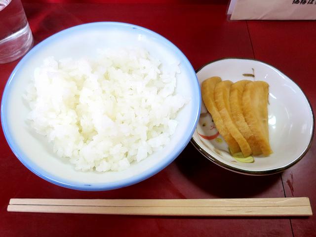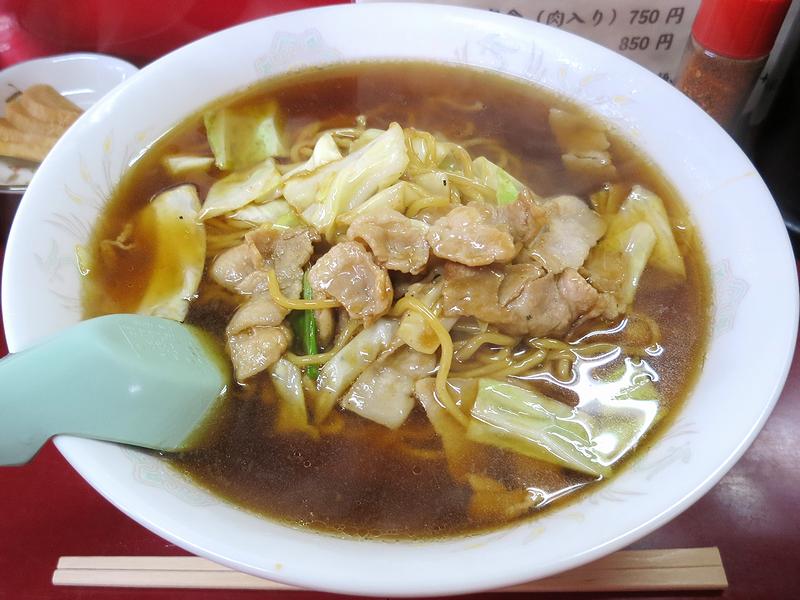 で、こちらのスープ入り焼きそばですが、最初はスープの、わりとエッジの効いた醤油味を強く感じるのですが、焼きそばのソースが混ざってくるとその甘味を感じまろやかに。麺は蒸し麺なんですかね?具の豚肉、キャベツと共にオーソドックスな焼きそばだと思うのですが、醤油味のスープと合わさることによるこのマリアージュというか、ほんと、良い感じです。更に途中から、卓上のコショウ、そして唐辛子酢を投入しつつ、今回初めて一緒にいただいたご飯と共にワシワシといけば、もう!ほんと、相性は抜群ですね。ただ、半ライスは本当に「半」量なので、次はスープ入り焼きそばを並にする代わりに、ライスを普通サイズでいっけば、個人的にはもっと幸せになれるかもしれません。