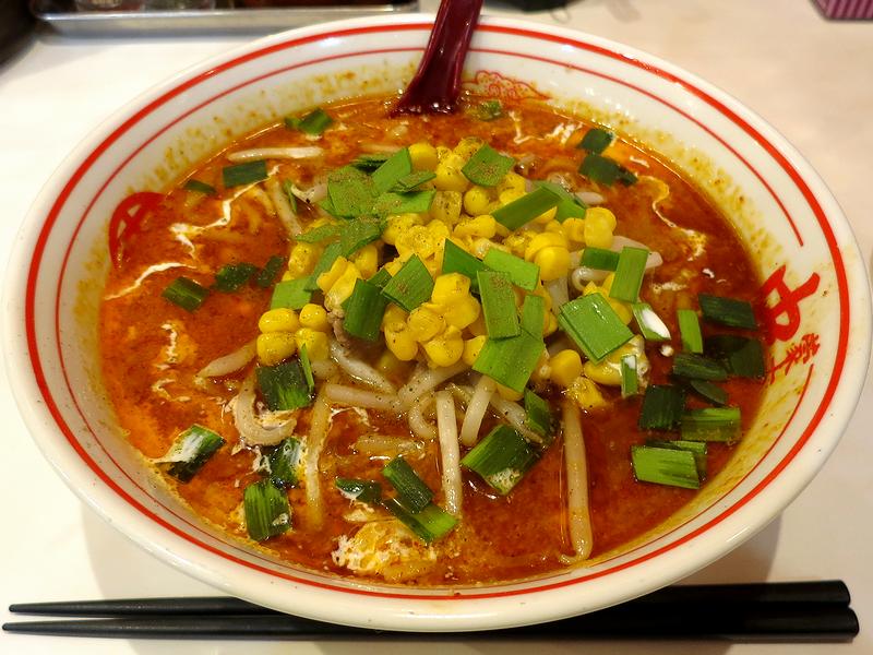 それで今回いただいたのは、期間限定メニューである甘縁坊(あまえんぼう)という品。事前に調べたところ、中本さんの基本である味噌スープに様々な調味料や具材を加えたものらしいです。で、まずは早速、あえて混ぜずにスープを啜ると、辛さレベルは10段階中の6だか7らしいのですが、味噌スープにちりばめられた唐辛子の辛味は結構感じます。ですがそれだけではないのがこの品で、山椒の香りと痺れ感、クリームのまろやかさ、そして名前の由来にもなっているハチミツの甘味もハッキリとわかる、ほんと、複雑な味で、それらがケンカせずにまとまっているのが何とも良いですね。そして具は、モヤシとコーンのシャキシャキ感とサッパリ瑞々しい味が、全体的に濃いめの中で良い感じの息抜きになっているような。生ニラは薬味的。あと豚バラ肉、そして豚挽きと肉類もたっぷりで、そこからの旨味も相当量出ていると思われます。で、これらと共に、中本標準?の麺をズルズルと啜れば、もう!っていうか、むせるのを警戒せず気兼ねなく啜れるって、こんなに自由だったんですね!