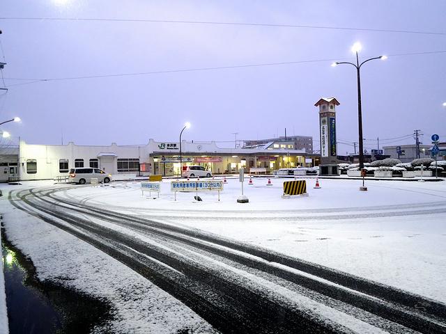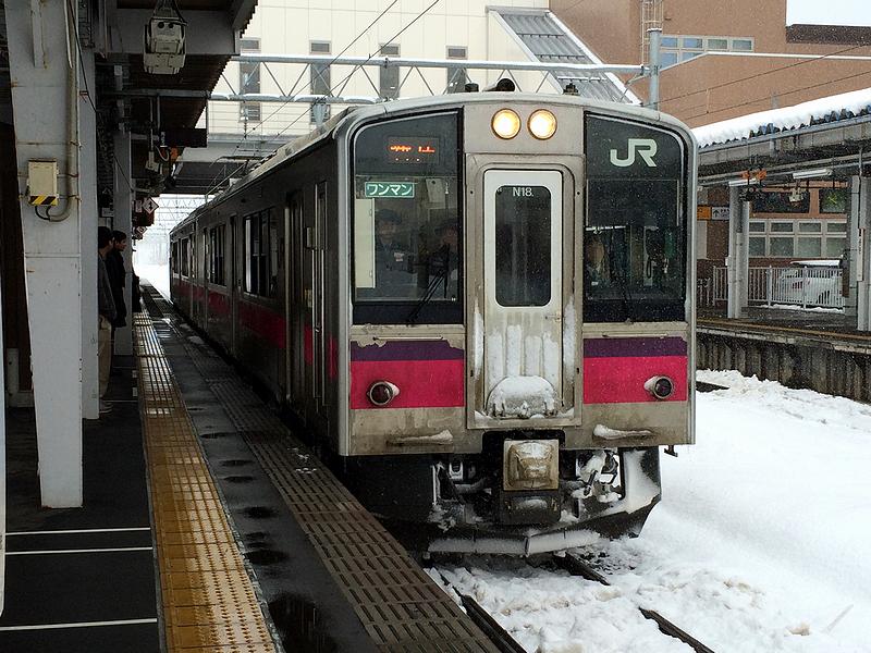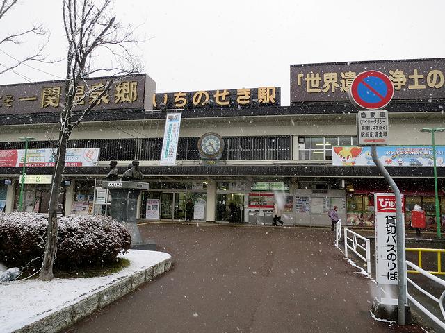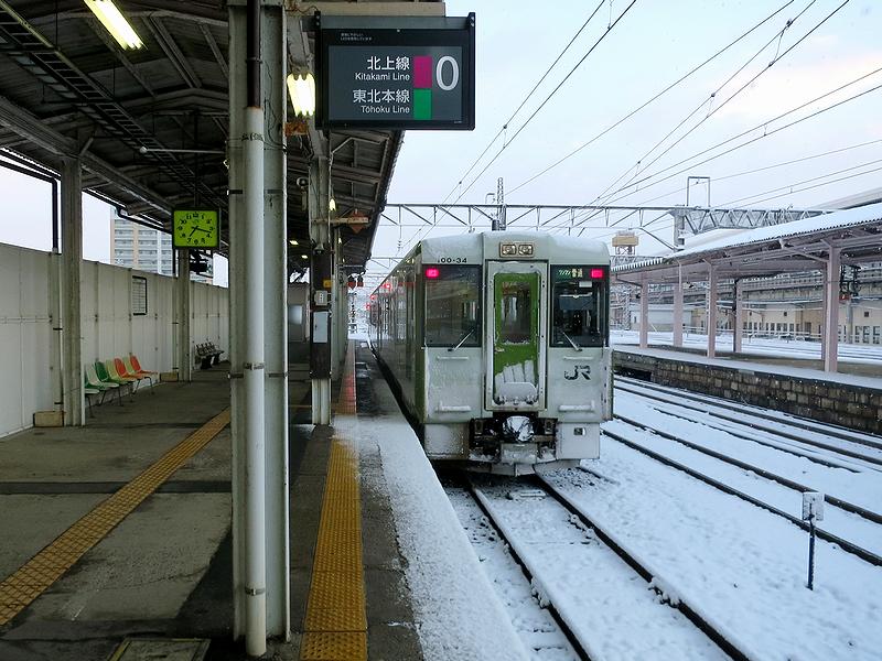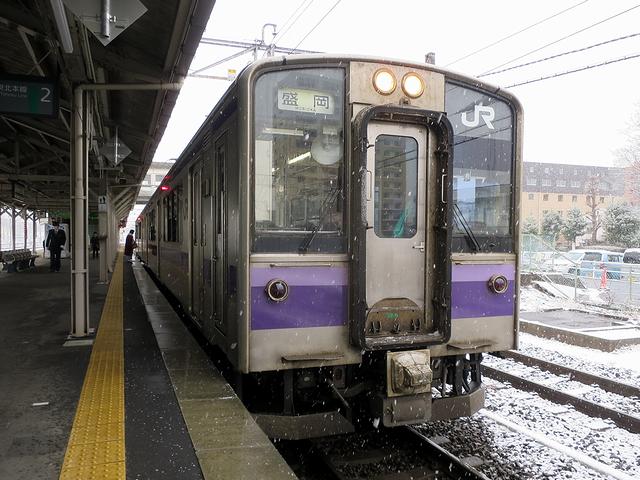私(ともう一人。しかもその人は私よりも長かった。)がトイレに寄ったせいか、高速バスは数分遅れて雪の降りしきる一ノ関駅に到着。次に乗るのは、一ノ関始発の午前8時59分発盛岡行き普通列車なのですが、発車まで30分以上あったのでとりあえず待合室に入ったところ、立ち食いスタンドを発見して、ついフラフラっと。元々鉄オタ(乗り鉄)で、駅そば・うどんは見つけたら食すということをやっていたものだから、こういう時「食べなきゃ!」という妙な使命感が出てしまうんですよね。その後改札をSuicaで通過して、盛岡行き普通列車が待つホームへ。ちなみにその列車に使われている車両は701系といって、平成5年にそれまでの客車列車など置き換えるために登場したものなのですが、ロングシートの車内など当時は鉄オタからかなり不評だったなぁ、と。それでもJR東日本産は増備を進め、東北地区の標準的電車として20年以上走り続けているのですが、その登場が個人的感覚だとちょっとだけ前という認識なので、時の流れを実感するというか。と、話が逸れましたが、定刻に発車した列車は雪の中を走って20分少々で水沢駅に到着。で、この間、お腹のビッグウェーブは相変わらず襲ってきて、一ノ関に停車中も含めると2度程トイレのお世話になったというか、車内がロングシートでも、トイレが有って本当に良かったというか。
