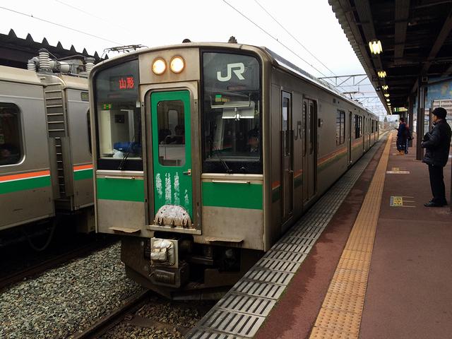 天童駅に戻り、ちょっとだけ待って、午後3時12分発の山形行き普通列車に乗車。それでその車中、あまり時間は無いのですが、山形から先の旅程を再検討。横手から乗った列車の車中で立て直した計画では、山形駅での普通列車接続が悪い関係もあって山形で約1時間、そのちょっと先の赤湯で約1時間ほど時間が取れるので、あわよくばタクシーなどを併用してその2箇所でラーメンをいただこうと目論んでいたのですが、腹具合と、山形市内で本日は初市のようなものが開かれいる関係で移動時間が読めないということもあり、山形はスルーすることに。(嗚呼、冷しラーメンが…。)それで、山形駅から普通列車に乗り継ごうとすると、前述のとおり接続が悪いため赤湯で約1時間というのは変わらないので、赤湯でタクシーに乗る代わりに山形から接続の良い新幹線に乗って時間を稼ごうということになりました。もっとも、これもすんなり決まったわけではなく、山形から仙山線で仙台に抜け、仙台駅で牛タンでも食べようかなんて案も出てきたのですが…。(これが、乗り継ぎ調べると行けそうなのよ…。)
