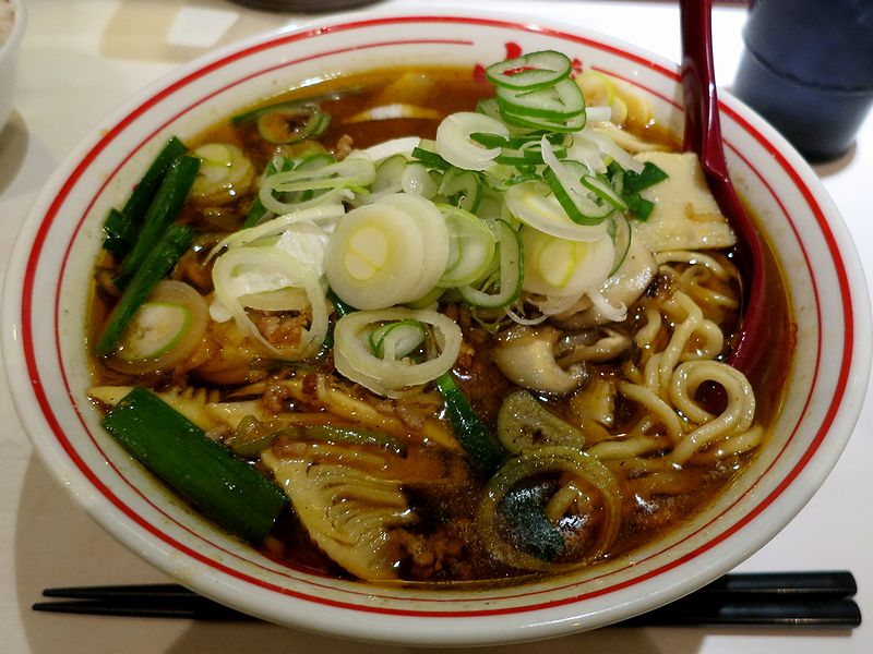 そんな中いただいたのは、現在渋谷店のみで期間限定販売されているこちらの品。見た目的には、中本さんの辛いメニューのように真っ赤っかではないものの、よく見ると醤油色のスープの上にラー油の層があり、意外と手強そう。なので意を決して、ラー油とスープをよく混ぜてからいただけば、まずは山椒の香りがスッとして、口に含めばと醤油味のスープと共にラー油の若干ピリッとした感覚、そして最後は山椒の痺れが残る、という感じでしょうか。ちなみに、食券の券売機に書かれた辛さレベルは4(0~10の11段階のうち)なのですが、感覚的には、ラー油の油分でマスクされるためか、そんなには辛く無く(個人的にはちょい辛程度に)感じました。また麺は、中本さん独特のムニムニした食感の中太麺。そして具は、その旨味がスープに溶け込んだ挽肉と椎茸、シャクシャク食感のタケノコに、ニラと白ネギという感じで。
