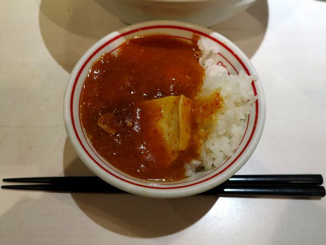 こちらは、一緒にいただいたもの。ご飯の上に載った通称蒙古麻婆はわりと唐辛子がストレートにキて麻辣麺よりも確実に辛く感じるのですが、やっぱり、中本さんに来たからには、ちょっとは辛いのを行っとかないとという感じで。でも、中本上級者になると、この蒙古麻婆がデザートになるのだから凄いですね。