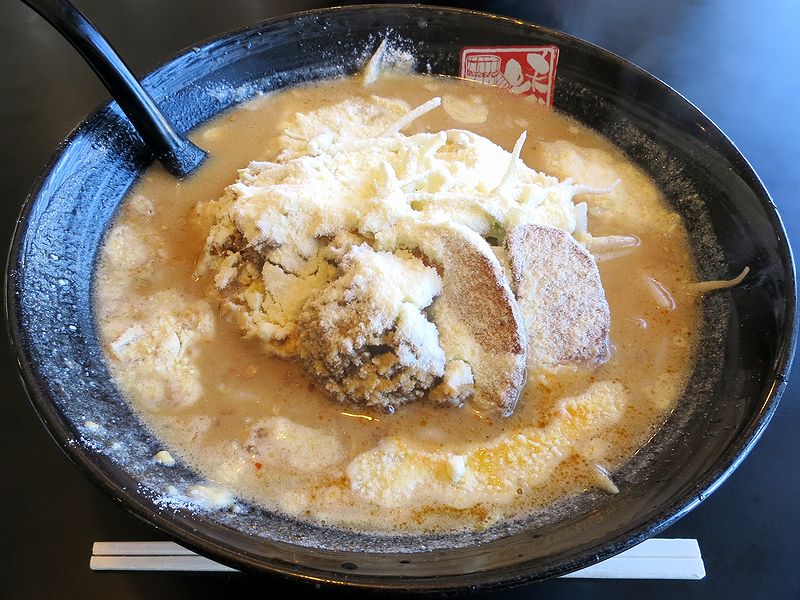 それが、思わず「こなぁぁぁぁぁゆきぃぃぃぃぃ」と歌い出したくなるこの品。写真のように粉雪を思わせる粉チーズが、大量に振りかけられています。それでまずはスープですが、こちらのお店のスープに使われる三種類の味噌、北海道、信州、九州のうち、ガツン来る塩気と味噌味噌しさが特徴の濃口の北海道味噌がベースになっていて、まろやかな粉チーズとの相性は抜群。そこに、肉味噌的挽肉が加わって、間違いが無い味ですね。そこに、意外にチュルっとした食感の中太縮れ麺や、わりと大量に埋蔵されていたシャキシャキのモヤシが絡みます。で、麺をいただき終わった後は、実はこれがお目当てだったライス投入。味噌チーズリゾットという感じなって、やっぱり旨いですね。