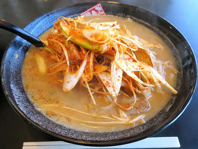 こちらは、同行者がいただいたものを、例によって味見させて貰いました。で、お品書きの写真だとネギが細く切られていたのですが、実物は写真のとおり大ぶりの笹切りになっていて、最後の最後まで結構生っぽい感じが。あと、ネギと和えられた生っぽい豆板醤が、元々塩気の強い北海道味噌スープに更なる塩気、そして唐辛子のエッジを加えていて、なんていうか、とても濃かったです。