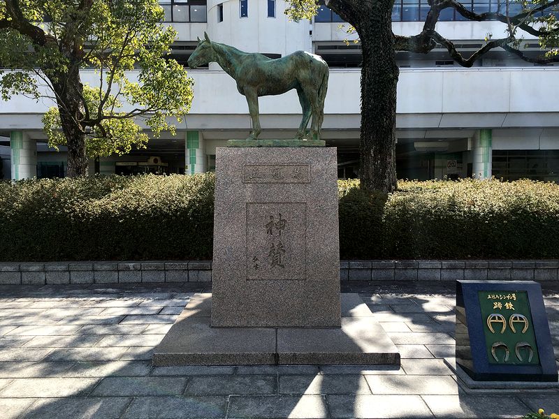 シンザンゲートを入ってすぐにあるのが、偉大な「五冠馬」シンザンの像。その脇には専用の蹄鉄であるシンザン鉄も飾られています。ですが、像自体は意外と小さめだったというか、実は最初気付かずに通り過ぎてしまったという…。