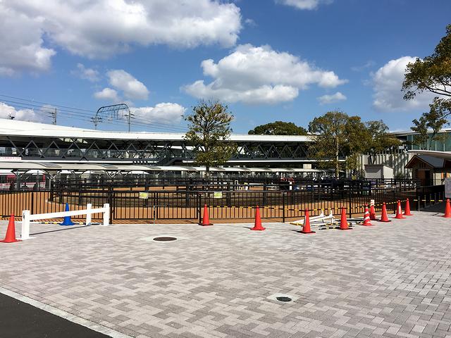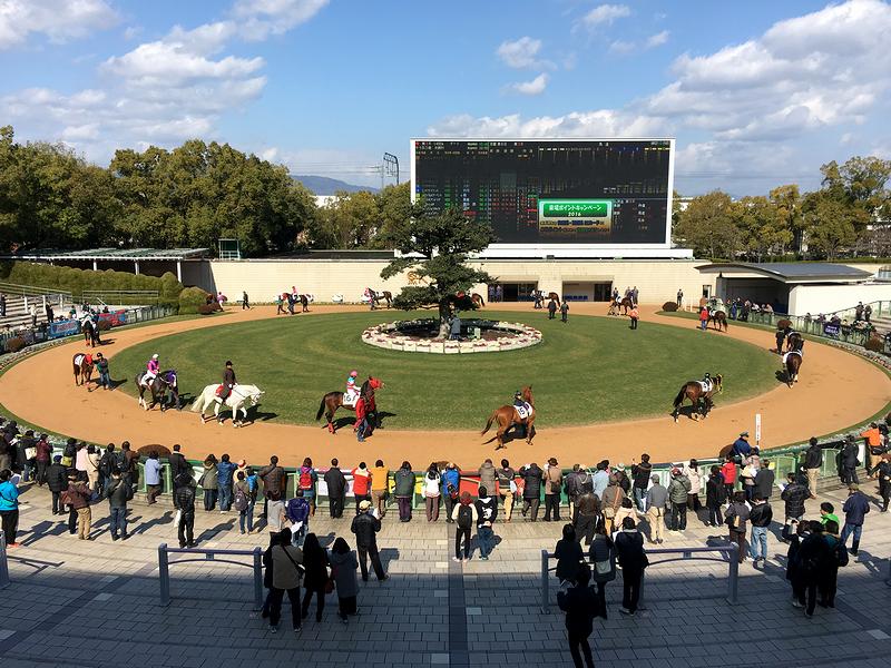 京都競馬場の特徴の一つが、まん丸なパドック。中心に生えているのはモチノキで、競馬場建設時からそこにあったそうです。