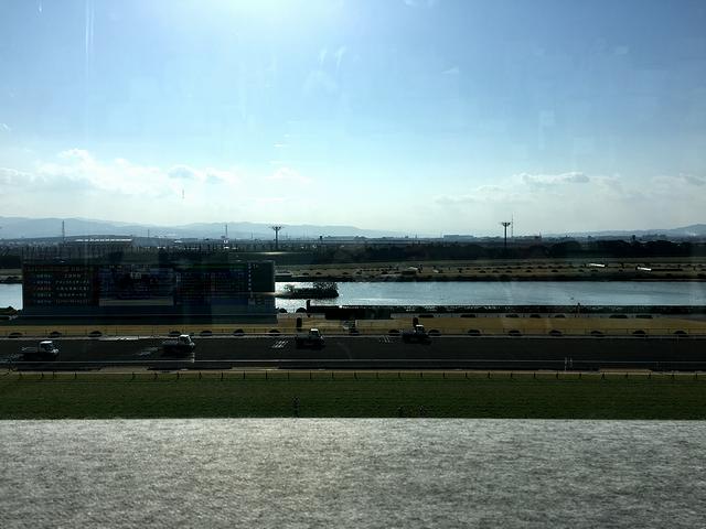 それでその中でも、最前列の席を予約していたのですが、5階の最前列だと、窓下端の高さの関係で、手前側の芝コースが見えづらいんですね。(背もたれに寄りかからずに背筋を伸ばさないと見えない。)かといって後ろの席にすると、角度によっては窓の前に置かれた荷物が邪魔(窓の前には荷物を置かないよう張り紙がしてありますが、皆さん結構お構いなしでバッグとか置いていました。)で見えづらそうだし。うーん。