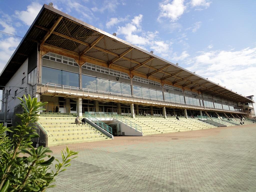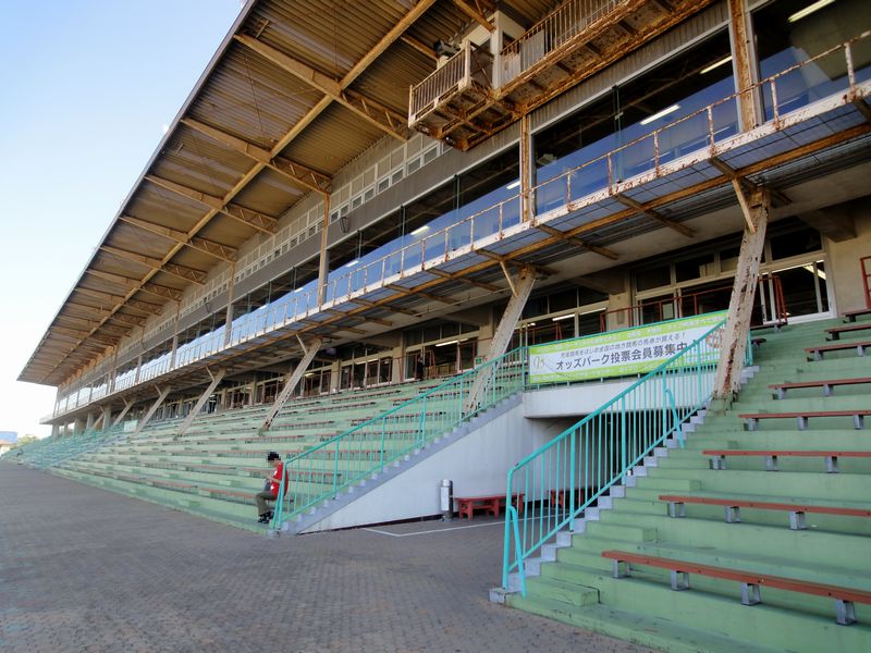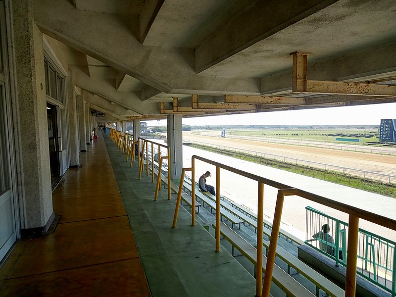 荒尾競馬場のスタンド。競馬場にもっと人が集まっていた頃に建てられたので、今やその広さを少々持てあましているよう。