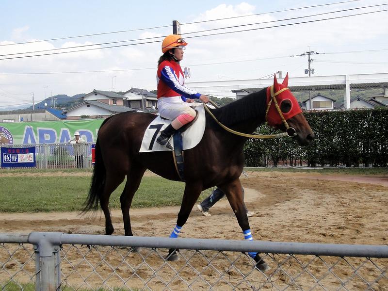 こちらは、荒尾競馬場所属の騎手のうち、唯一の女性騎手である岩永千晶騎手。この日は、第1レースで勝利を挙げる活躍でした。