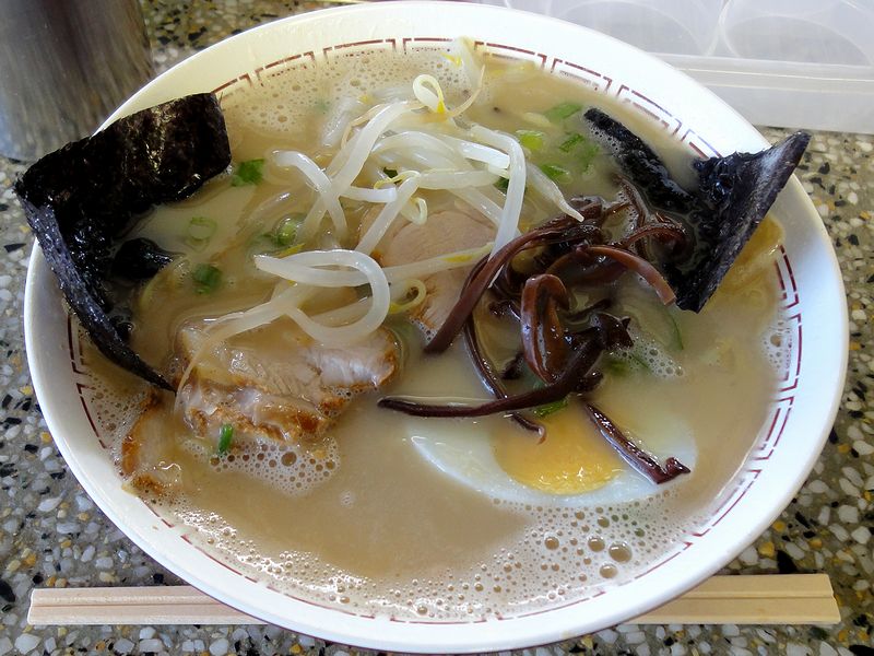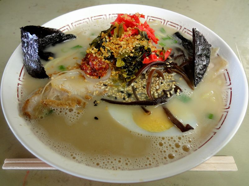で、こちらのラーメン。スープは、久留米系の流れを汲むかのようなどっしりとした濃厚さがあるのですが、いただいた感じから呼び戻し製法を使用していない(違っていたら申し訳ない)為かそれほど豚骨の匂いは強烈ではなく、個人的には風味はどちらかというとマイルドに感じました。そして麺は、当地で良くある中くらいの太さでコシのあるもの。それと具は、あっさりとして肉の味が楽しめるチャーシューと、濃厚なスープと良く合うモヤシ、そして海苔が1枚ではなく2枚というのが嬉しかったりして。また、カウンター上には無料の薬味類が多数置いてあり、熊本ではそれほど見かけない(ような気がする)紅ショウガと、熊本ではわりと見かける(ような気がする)揚げニンニクが置いてあるあたりが、福岡県境にある荒尾のラーメンという感じがしました。それにしても、競馬場でこれほど本格的で美味しいラーメンがいただけるなんて、ちょっと感動したというか。