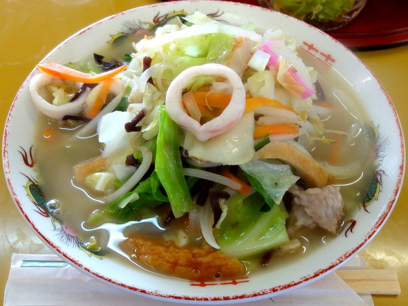 そこで私がいただいたのは、こちらのチャンポン。ちなみにチャンポンは長崎県が発祥ですが、天草灘や島原湾、有明海を挟んだところにある熊本県でもよく食べられているのでしょうか?と、話が逸れましたが、このチャンポン。まず見た目ですが、具がてんこ盛り。早速その具をかき分けてスープからいただくと、濃い目の味付けの、何ともハッキリとした味。荒尾競馬場のウェブサイト(の、『グルメ de 競馬』というコンテンツ)には「荒尾・大牟田地区(特に県境を中心として)の食堂や食品(菓子・加工品)は、炭鉱があったおかげか味の濃い(特に塩味)仕立ての傾向にある。」と書いてあり、まさしくそんな感じですが、ただ味付けが濃いだけではなく、具材の旨味が溶け込んだ、何とも旨いスープですね。また、太いちゃんぽん麺は、煮込まれてもプリっとした食感が残ってます。そして前述のとおりてんこ盛りの具は、イカなどの海鮮系に、豚肉、練り物系のサツマ揚げとカマボコ、そしてキャベツ、モヤシ、人参、キクラゲなどのたっぷりの野菜類。見た目どおり何とも食べ応えのある1杯で、満足いたしました。