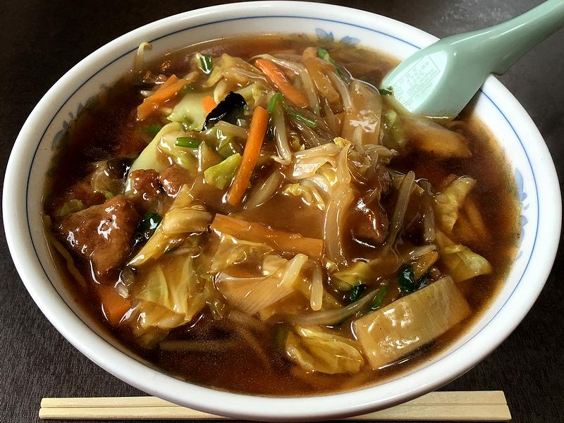 それでいただいたのが、件の品であるこちら。元々レバーは好物ですし、トロミの付いたラーメンも嫌いじゃないということで。で、早速いただいてみたところ、ベースとなるスープは清湯でしょうか?いかにも中華料理店のという感じ。そこに、絶妙な火の通し加減なレバーとたっぷりの野菜が入った餡が掛かっているのですが、個人的には、水戸のスタミナラーメンを思い出しました。ただ、あちらのに入っているカボチャがない分、甘さのないさっぱりとした感じですかね。また麺は、中くらいの太さで、緩く縮れている感じで、食感は、ぷりっとハリがあるというか。そしてそれらが、いただいているうちに混ざり合って、これもまた。最後にお酢を投入してみたところ、これも合いますね。