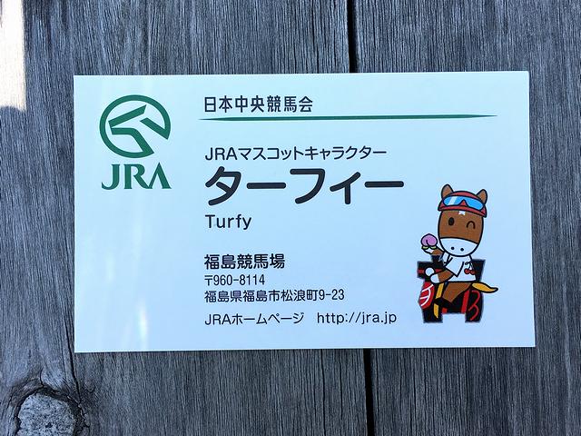 この日は、馬場内広場で久しぶりにターフィーさんを見かけた(多分毎回出てはいるのですが、個人的になかなか巡り逢えなかった)のですが、福島競馬場バージョンとでも言うべき服装になっていました。で、お名刺をいただいたのは初めて。