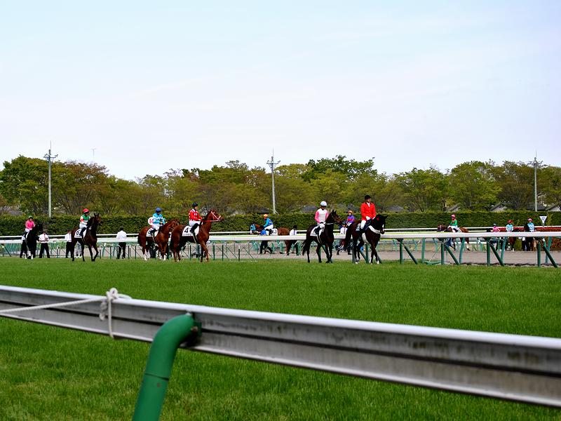 福島競馬場での馬場入りは、スタンド2階にあるパドックから地下馬道を通って一度ダートコース内側に出てから、という感じで。