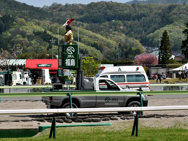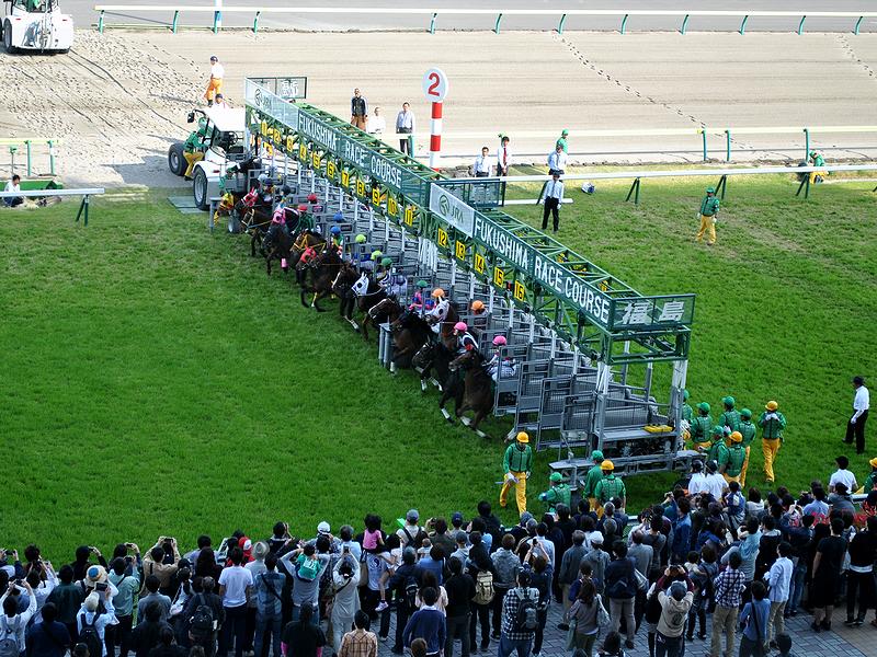 前の記事に書いたとおり、福島競馬場のコースは、芝コースが1周1600m、ダートコースが1周1444.6mと最短で、最後の直線も300m弱と短い方(小倉とは同程度。ただし、札幌・函館の方が30mほど短い。)なのですが、かといって先行が絶対的に有利ではなく、最後の直線が上り勾配のせいか差しも結構決まるという印象。それにしても、スタンドから馬場の近さは、JRAでも屈指じゃないでしょうか。