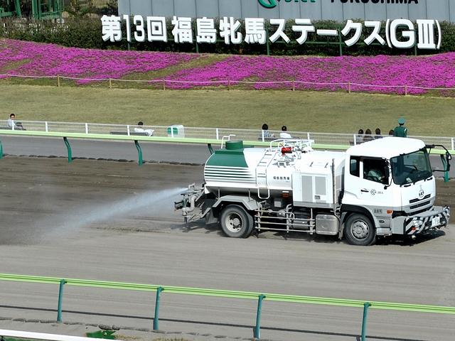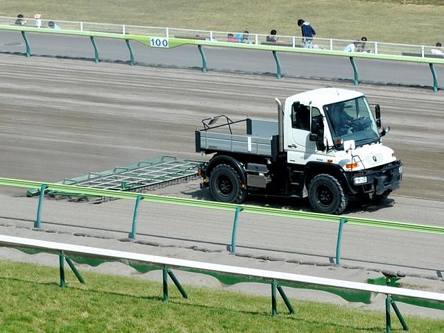 ダートコースのハロー掛けはJRA標準のウニモグで。またこの日は、天気が良く風もわりと吹いていたので、散水車も活躍していました。