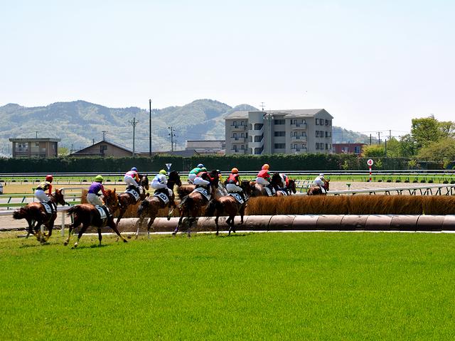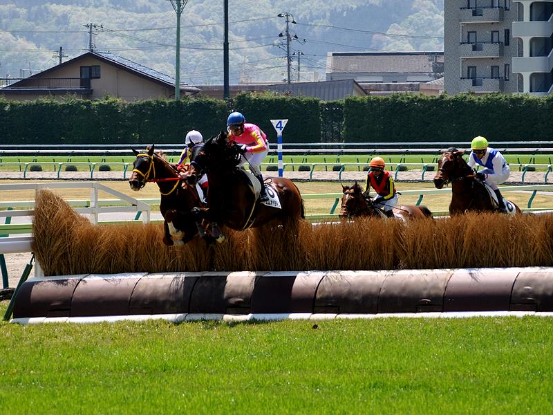 【両面竹柵障害を逆回りに飛ぶ競走馬】