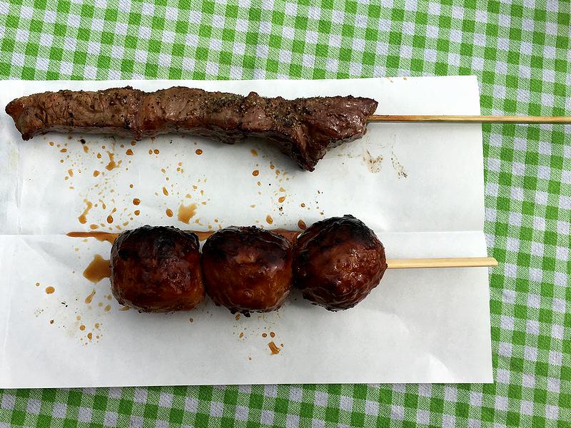 そこで購入したのがこちらの2品。味付けはタレと塩コショウが選べ、牛串は塩コショウ、つくねはタレ味で。で、どちらも美味しかったのですが、当然のことながら牛串の方はすこぶる付きで、ジューシーなお肉と脂の甘味がたまりませんでした。