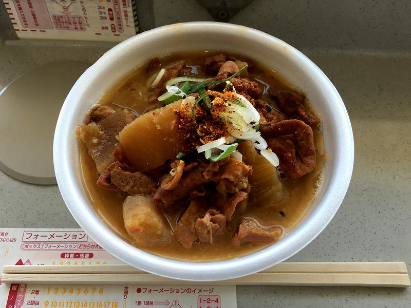 「福島競馬場名物」の幟が立つこちらのお店。その名物がこちらの品で、それこそ来る度にいただいているので今更なのですが、まろやかな味噌ベースの味付けをされた、柔らかいモツと味の良く染みた大根は、やっぱり旨いです。これをいただかないと、福島競馬場に来た気がしないんですよね。