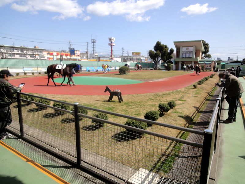 名古屋競馬場のパドックは、地方競馬の競馬場としては平均的な大きさかと。(といってもこれまで、生で直接見たことがあるパドックは限られているのですが。)あと、名古屋競馬場には誘導馬はなく、騎手が騎乗し周回の終わるとそのまま馬場へと向かうようになっています。