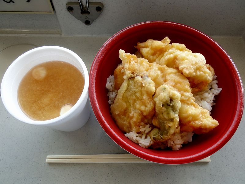 今回、昼食でいただいたのがこちら。ご飯の上には、大ぶりな鶏肉が2つと、サツマイモ、シシトウの天ぷらが載っていました。で、実はこのメニューは初めていだくのですが、天ぷらにされた鶏肉はフワッとした食感もあり、タレも良い塩梅で、かなりのヒット。また一緒にいただいたみそ汁ですが、具はシンプルであっさりとした味。ですが、そこがこの丼には合っているかと。