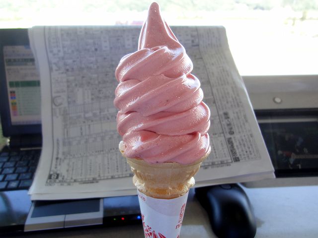 こちらは、珍しく自らいただいた物。生のイチゴが入っているとかはありませんが、サッパリしててうまいです。それにしても、このいちご味のソフトって、1階の売店以外でも売っているのでしょうか?