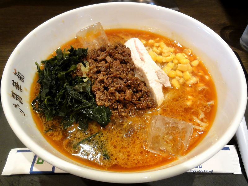 これは私がいただいたもので、スープには氷が入っていますが、日本式の担担麺を汁ごと冷たくしたメニューという感じ。冷たいスープは当然ながら胡麻がベースなのですが、後味サッパリで、辛味が結構効かされていました。また中くらいの太さの麺も、当然冷たく締められ、お陰でけっこえな歯ごたえ。そして具は、挽肉、鶏肉とコーン、そして結構大量のワカメ。