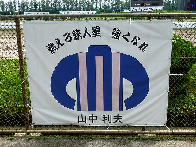 【コース際に貼られた山中騎手の横断幕】