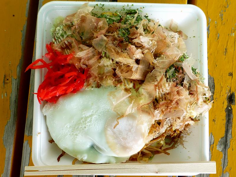 目玉ペアは、お好み焼きと焼きそばに目玉焼きが載ったボリューミーな一品。どちらも若干甘味のあるソースが効いていて、ベーシックながらちゃんとしたもの。それにしても、これだけでお腹が一杯になりますね。