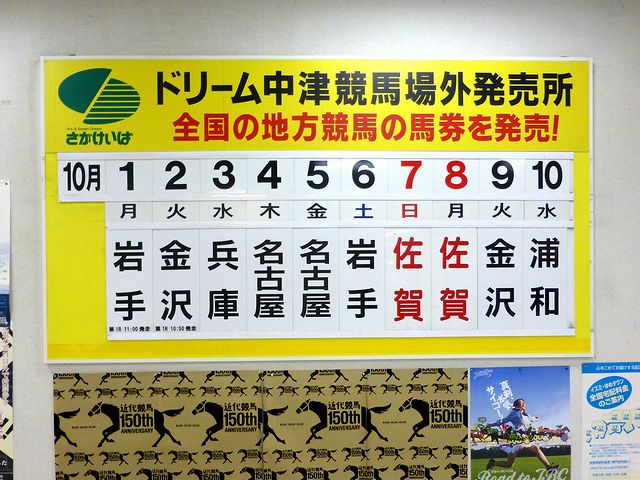 で、程なくして目的のドリームなかつを発見。入口の所には発売日程が掲げられていたのですが、写真のとおり、佐賀だけではなく、佐賀開催日以外も毎日他場を発売しているんですね。