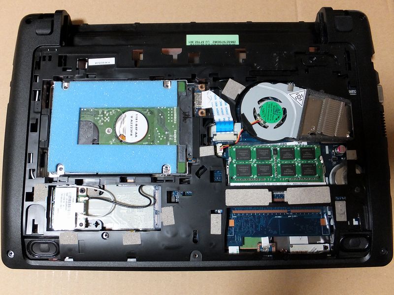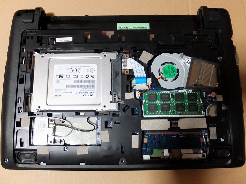 このネットブックはメンテしやすいというか、裏返してバッテリー外してネジを1本外せば内部にアクセスできます。ちなみに、そのネジのとこには封印のシールがはってあり、はがすと保証が効かなくなりますのでご注意を。(もっとも、この子は購入してすぐにメモリを2GB→8GBに交換した際に、そのシールは無くなっていますが。)
