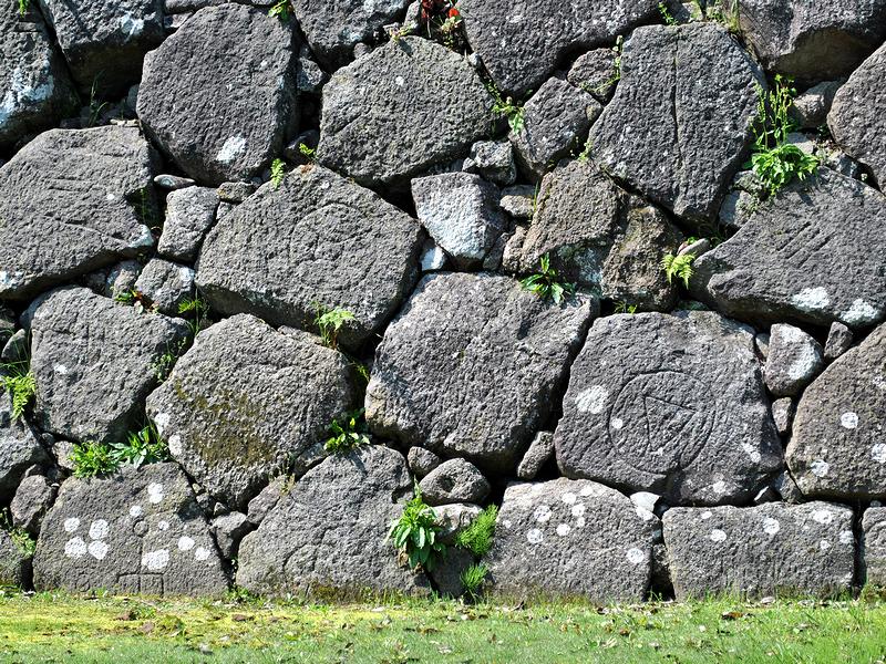 鶴丸倉庫の反対側が、戌亥櫓跡から続く戌亥櫓石垣。で、ここは打ち込みハギという技法で積まれているのですが、その石の数々には刻印が施されまくりという感じで。