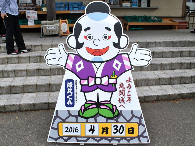 それでいよいよお城へと向かうのですが、その第一印象は、とってもコンパクト!これでほぼ全景となっています。で、お城の手前にある一筆啓上茶屋という売店兼飲食店の前には、旧丸岡町のイメージキャラクターである城丸くんがお出迎え。それにしても、何とも味があって良いキャラですね。