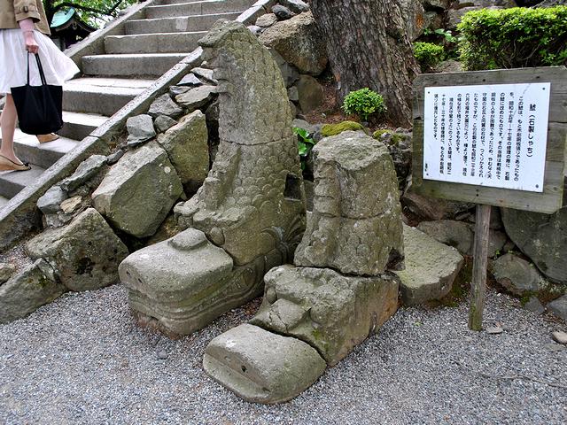 天守の登り口に置いてあったのが、この石製のしゃち。お城の天守と言えばシャチホコですが、丸岡城のは元々木彫銅板張りだったものを、戦前の修繕の際、瓦と同じ材質の石製のものに載せ替えたそう。ですが福井地震の際に落下し、その修復に際して木彫銅板張りのものに戻されたとのこと。で、どうでも良い話ですが、後ろに写り込んでしまったお姉さんの格好が、これから天守に登ろうとする服装じゃ…。(丸岡城天守内の階段は、現存の中でもかなり急角度なんです)